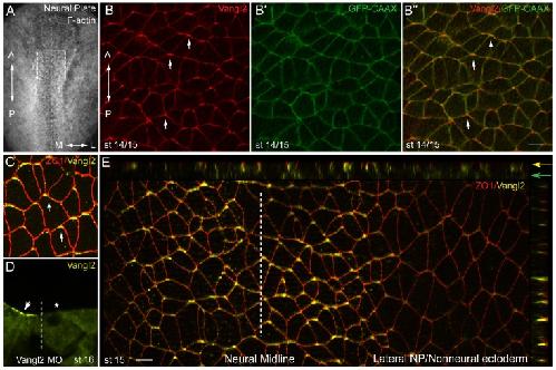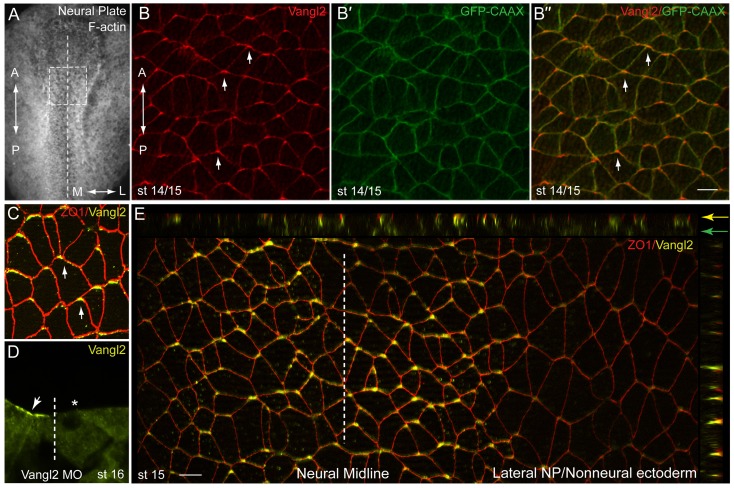 Figure 2. Non-homogeneous subcellular distribution of Vangl2 along the anteroposterior axis. Early embryos were injected with 100 pg of GFP-CAAX RNA to label cell boundaries. At early neural plate stage, embryos were fixed and immunostaned with anti-Vangl2 and anti-GFP antibodies. En face view of the neural plate is shown, anterior is to the top. (A) Neural plate explant with the approximate position of the imaged area (B-B’’) (boxed). Dashed line indicates the neural midline, also applies to (D, E). The anteroposterior (A-P) and the mediolateral (M-L) axes are shown. (B) anti-Vangl2 and (B’) anti-GFP staining (B’’) Merged image. Arrows point to anterior Vangl2. (C) Double staining with anti-Vangl2 and anti-ZO1 reveals the anterior localization of Vangl2. (D) Cross-section of a neurula stage embryo injected with Vangl2 MO. Vangl2 immunostaining is reduced by the unilateral injection of Vangl2 MO (20 ng) (asterisk). Arrow points to apical Vangl2 at the uninjected side. (E) Apotome imaging of a normal control embryo costained with anti-Vangl2 and anti-ZO1. Z-stacks reveal apical/subapical staining of anterior Vangl2 patches at the midline (yellow arrow) as compared to the lateral/basolateral staining in non-neural ectoderm (green arrow). The midline is indicated. Scale bar, 20 μm. |