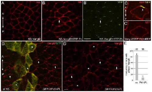 Fig. 3. Vangl2 polarity is directed by Prickle.Early embryos were injected with HA-Vangl2 (150â pg) and YFP-Pk RNAs (100â pg) either separately or together as indicated. At early neural plate stage, embryos were fixed and immunostaned with anti-HA or anti-GFP antibodies. (A) HA-Vangl2 is homogeneously distributed at cell boundaries. (B,Bâ²) The complex of Vangl2/Pk is polarized at the anterior end of each cell. HA-Vangl2 (B) and YFP-Pk (Bâ²). (C,Câ²) The anterior localization of the Vangl2/YFP-Prickle complex in an expressing cell is visualized by YFP and membrane RFP (mRFP) epifluorescence. (D,E) Early embryos were coinjected with zPk1ÎPL RNA (1.5 to 2â ng) and GFP as lineage tracer (100â pg). (D,Dâ²) Immunofluorescence reveals Vangl2 anterior accumulation (arrows) in the neural plate, with the exception of the cells containing zPk1ÎPL (marked by GFP, asterisks). Dorsal view of the neural plate midline is shown, anterior is to the top. (E) Quantitation of the data shown in D. See also Fig. 4C for control RNA effect. Error bars represent s.d. Co, control cells on the uninjected side. Scale bars are 20â µm in B,D, and 5â µm in C. |