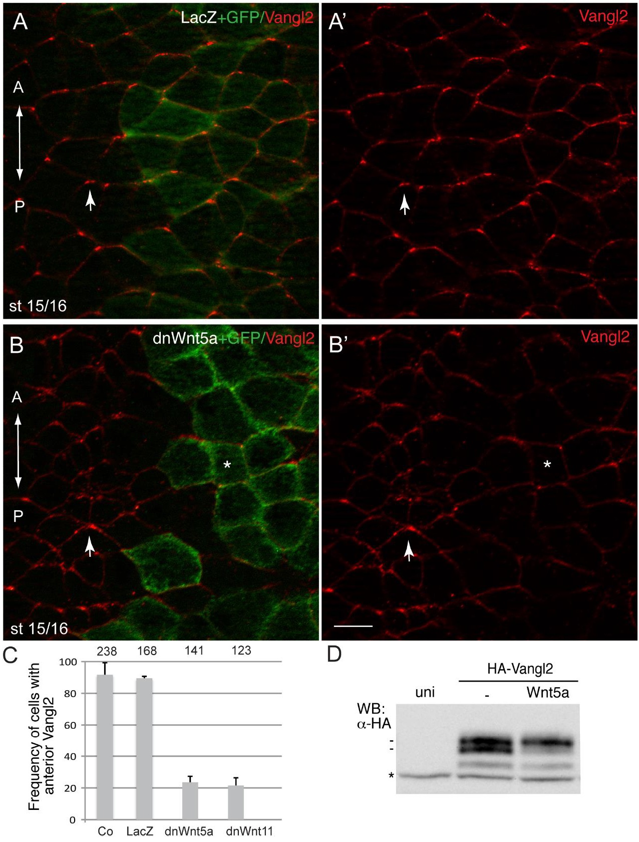 Fig. 4. A role of Wnt signaling in establishing the Vangl2 polarity.(A,B) Early embryos were injected with DN-Wnt5a RNA (0.3 ng) and GFP RNA (0.1 ng) as a lineage tracer. Neural plate cells mosaically expressing this construct reveal lack of Vangl2 enrichment at the anterior of each cell (asterisks) as compared to non-expressing cells (arrows). A', B' are single-channel images corresponding to A and B. Control LacZ RNA (1.5 ng) coinjected with GFP RNA (0.1 ng) had no effect on anterior distribution of Vangl2. Dorsal view of the neural plate is shown, anterior is to the top. Scale bar, 20 µm. (C) Quantification of data from the experiments with DN-Wnt constructs showing mean frequencies of cells with anterior Vangl2±s.d. At least 5–10 embryos were examined per each treatment. Numbers of scored cells are shown on top of each bar. (D) Vangl2 is phosphorylated in response to Wnt5a in Xenopus ectoderm. Early embryos were injected with HA-Vangl2 mRNA (0.1 ng) together with Wnt5a RNA (0.5 ng). Cell lysates were prepared at the midgastrula stage (st. 11) for western analysis with anti-HA antibodies. Wnt5a causes HA-Vangl2 to migrate slower in whole embryo lysates (st. 11). Asterisk indicates a non-specific protein band reflecting protein loading. |