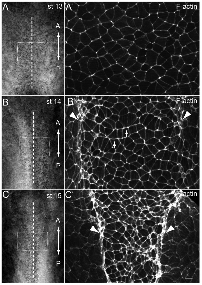 Fig. 1. Polarized F-actin cables in the Xenopus neural plate.F-actin was visualized by phalloidin staining in the Xenopus neural plate at the beginning of neurulation. Representative explants are shown at stage 13 (st. 13, A), st. 14 (B) and st.15 (C). Boxed regions are magnified in A′–C′. Apical constriction of neural plate cells is first evident along the dorsolateral hinge regions (arrowheads), and later throughout the neural plate. F-actin cables become more pronounced in the mediolateral rather than anteroposterior orientation, forming stripes along anteroposterior cell faces (arrows). The anteroposterior (‘A–P’) axis of the neural plate is indicated. Dashed line, the neural plate midline. Scale bar, 20 µm. |