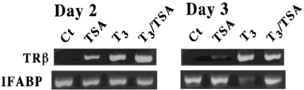 Figure 3. TSA induces direct TR target genes but blocks the regulation of late T 3 -response genes in premetamorphic tadpole intestine. Stage 55 tadpoles were treated with T3 (5 nM) and/or TSA (100 nM) for the indicated number of days. Total RNA was extracted from isolated intestine and assayed by PCR for the mRNA levels of indicated genes. IFAPB: intestinal fatty acid binding protein. See [91] for details. |
