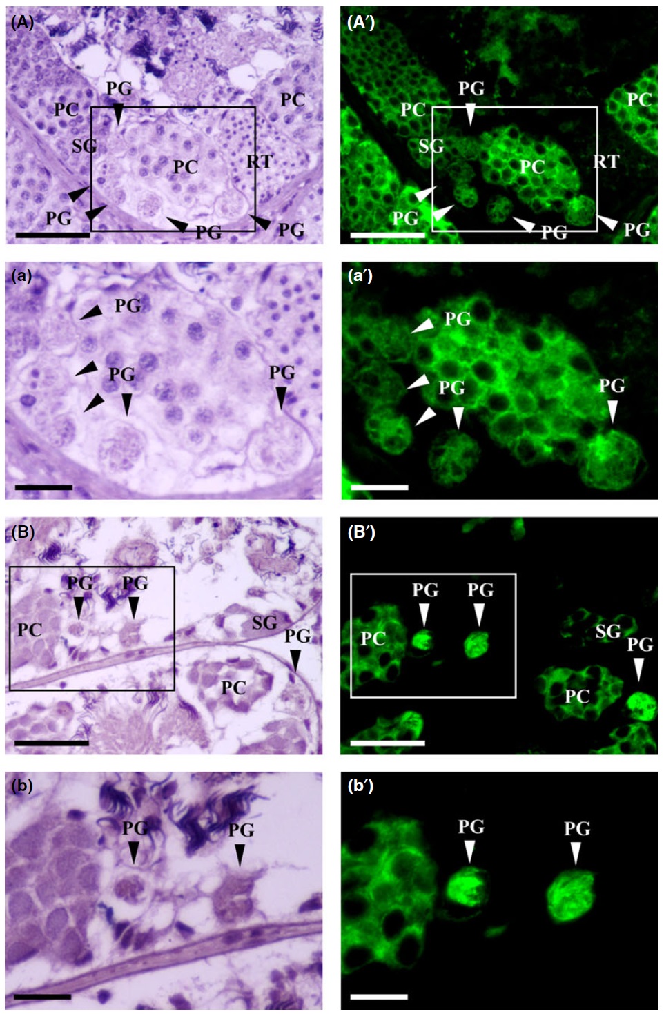 JAK1 mRNA in the PGs was detected by in situ hybridization on the sections from Cytochalasin B-treated adult testis (Aâ, Aâ, Bâ, and Bâ)