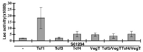 Tcf3 did not activate the promoter and Tcf4 exhibited a weak activity. Single injection of Tcf1, Tcf3