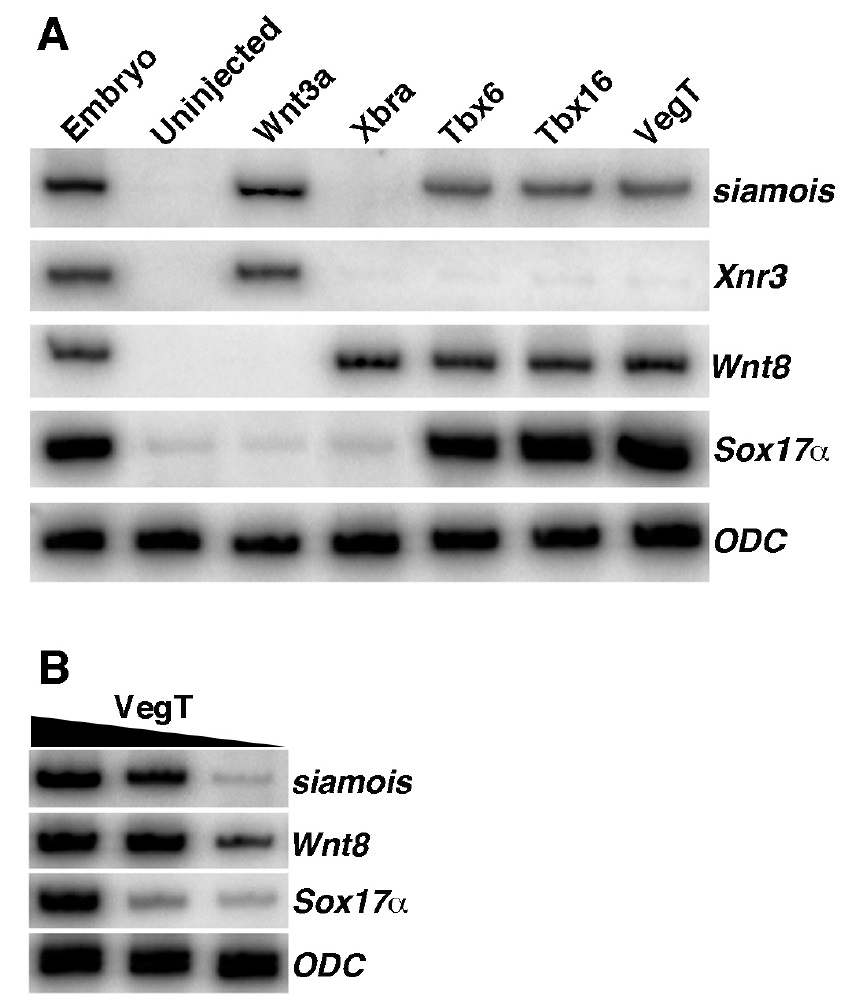 The endoderm gene Sox17α is induced by a high dose of VegT mRNA. ODC was used as a loading