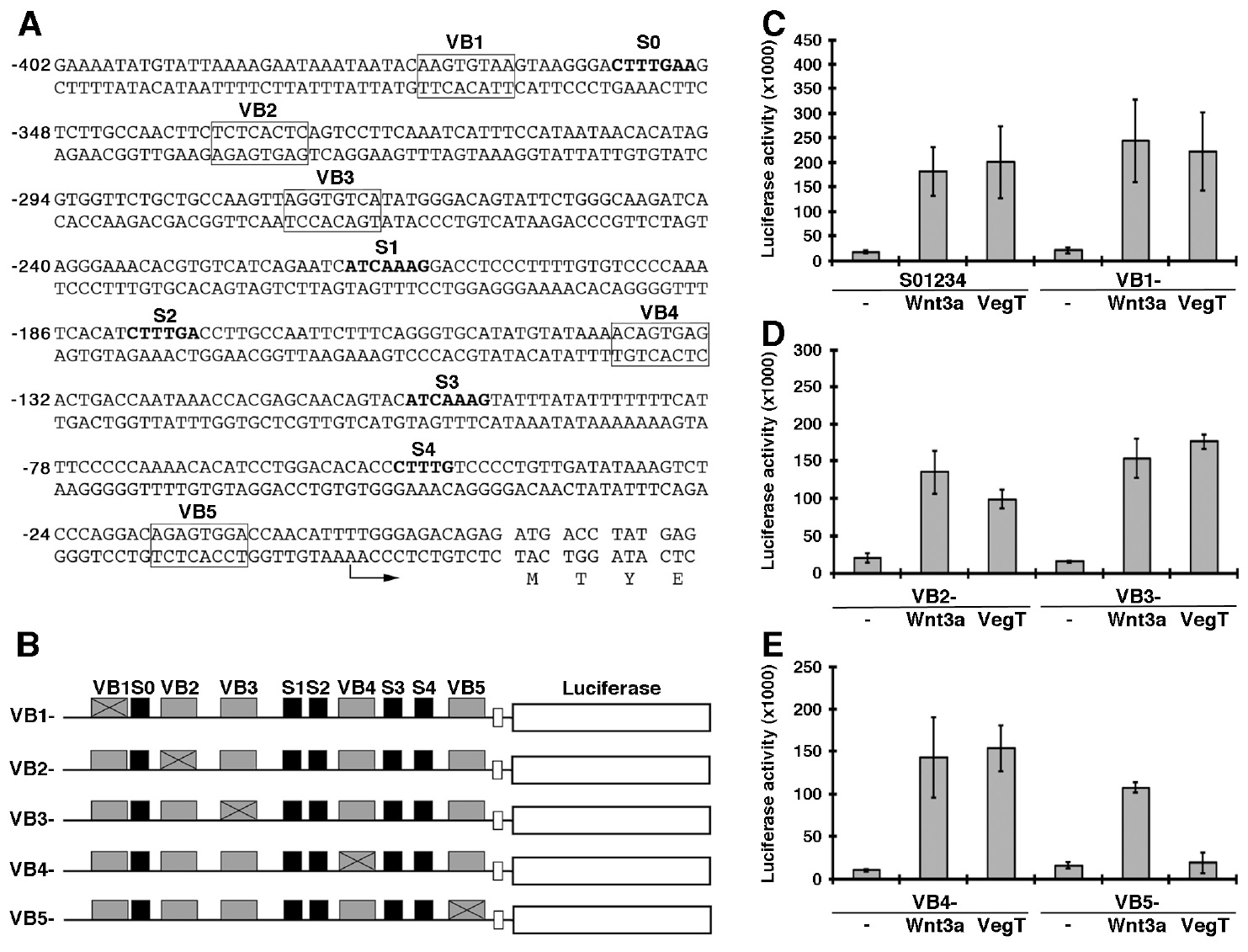 VB3 or VB4 does not affect the response of siamois promoter to Wnt3a or VegT. Mutation of VB5