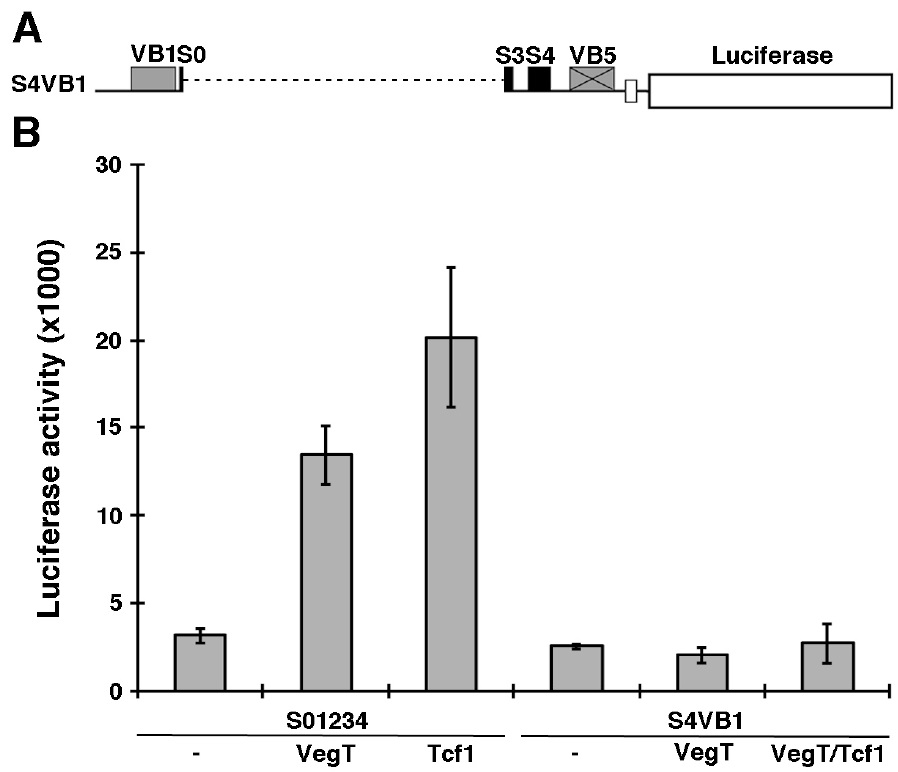 VegT cooperates with Wnt3a or Tcf1 to activate the VB5- siamois promoter reporter mutated at VB5