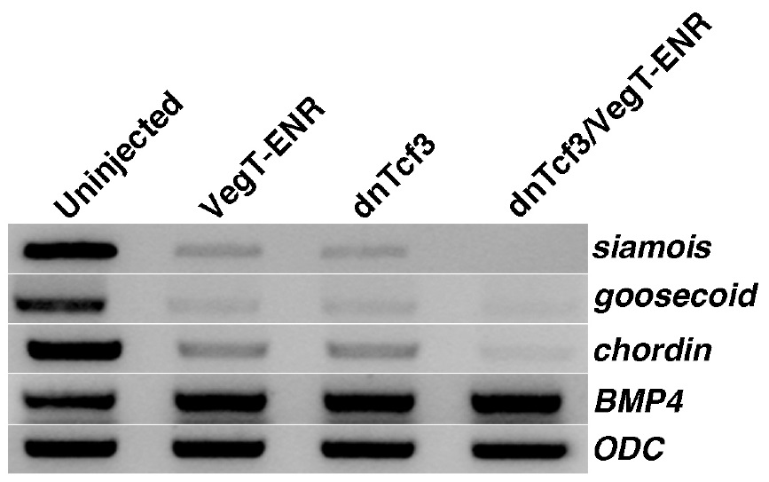 VegT-ENR more efficiently blocks chordin expression than single injection of dnTcf3 or VegT-ENR.
