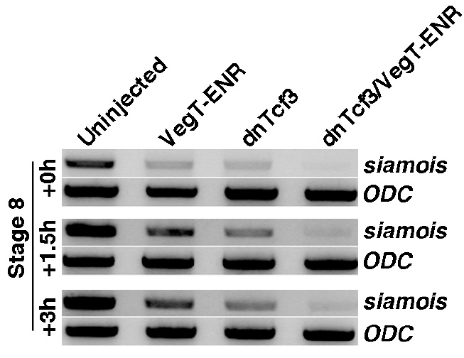 transcription (stage 8) and at a 1.5 hours interval. Simultaneous inhibition of VegT and Wnt