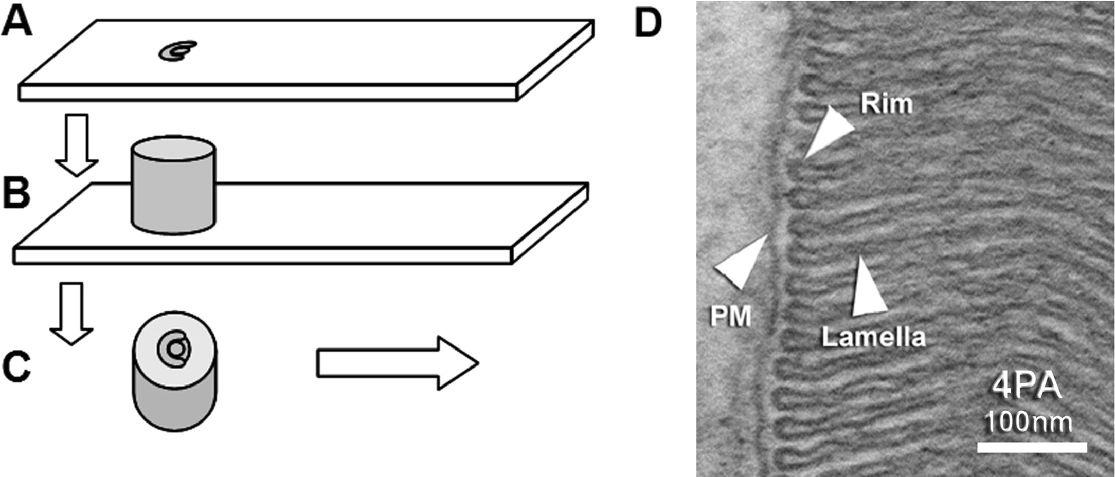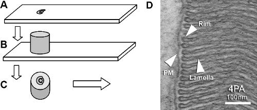 Methodology for embedding of cryosections. Cryosections collected on glass slides are processed through osmium, ethanols, and infiltrated with resin (A), and finally embedded in a cylinder of resin (B). The resin cylinder is separated from the slide (C), and the block face is trimmed and sectioned (D). D: Fixed in 4% paraformaldehyde (4 PA).