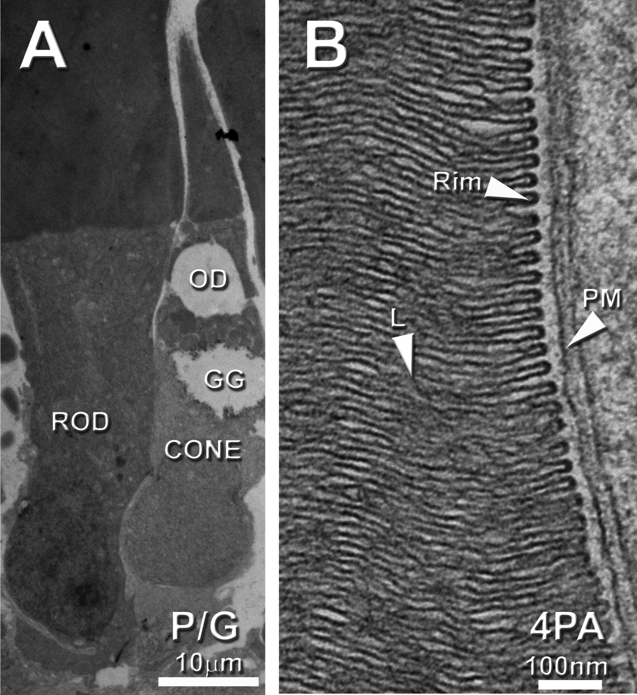 Artifacts associated with TEM of plastic-embedded retinal cryosections. A: cone photoreceptor outer segments lack definition in the region typically occupied by glycogen granules (GG). OD = oil droplet. Right: outer segment disk lamellae (L) are less well defined in samples fixed without glutaraldehyde, although disk rims (Rim) and plasma membrane (PM) are typically well defined. Left: 4% paraformaldehyde 1% glutaraldehyde (P/G). Right: 4% paraformaldehyde (4 PA).