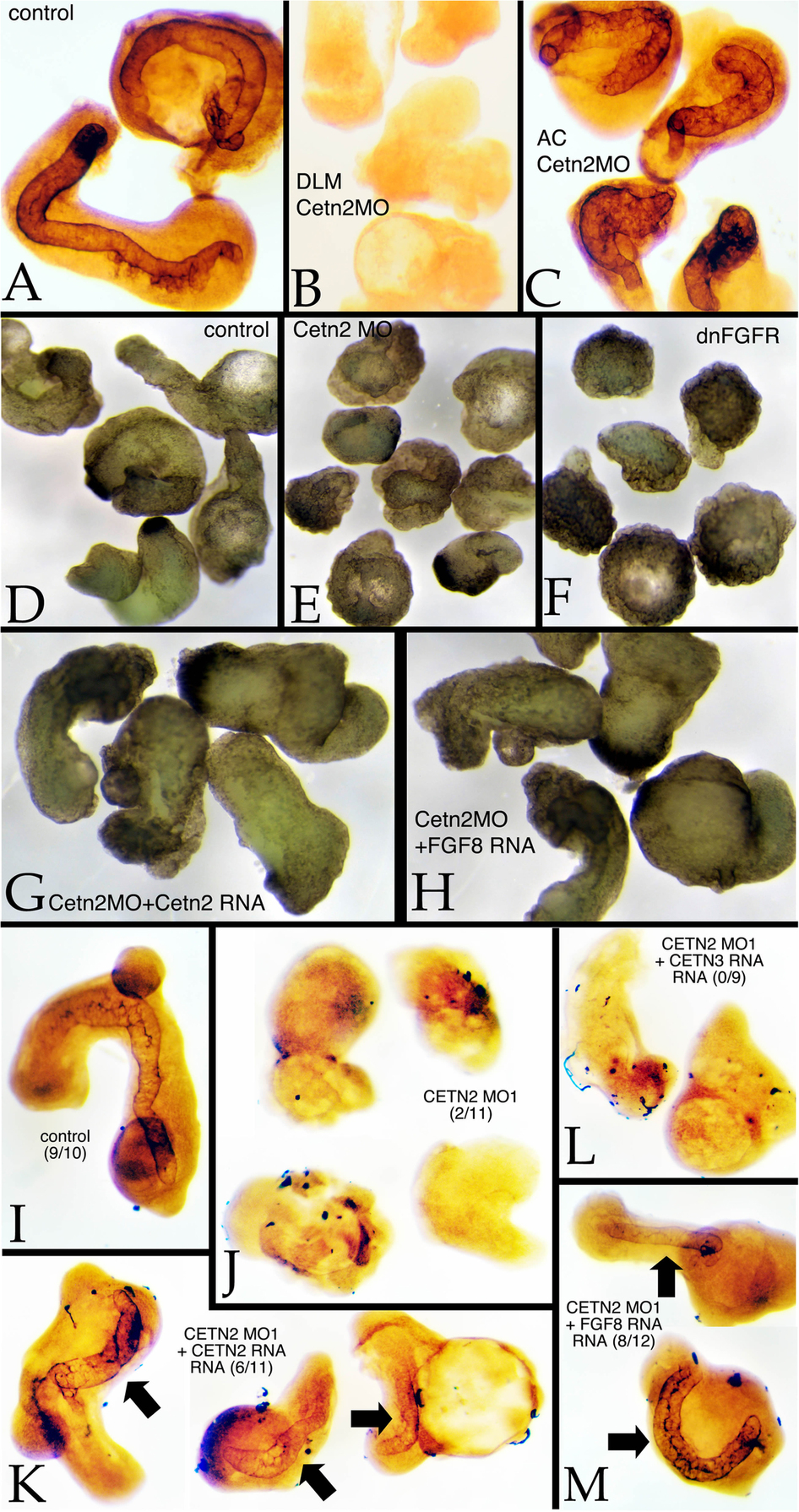 Figure 3. Animal cap/dorsal axial mesodermal zone (AC/DAMZ) explants were prepared from experimentally manipulated embryos when control (intact) embryos had reached stage 25. In wild type explants (A) staining with the anti-keratan sulfate antibody MZ15 revealed explant elongation and notochord formation. Both were absent in wild type AC/Cetn2 morphant DAMZ explants (B). Notochord formation occurred in Cetn2 morphant AC/wild type DAMZ explants (C). A comparison of dorsal axial mesoderm explant morphology (D-H) revealed the elongation of control explants (D), this elongation phenotype was absent in Cetn2 morphant explants (E) and dominant-negative FGFR RNA injected explants (F). In Cetn2 morphant explants, the elongation phenotype was rescued by either Cetn2-GFP (G) or FGF8 (H) RNA injection (200 pgs/embryo). Morpholinos were injected at 10 ng/embryo. Staining with MZ15 revealed the presence of notochordal tissues in control (I) explants, its absence in Cetn2 morphant explants (J), and its reappearance in Cetn2 RNA (K) and FGF8 (M), but not in Cetn3 RNA (L) injected Cetn2 morphant explants - number of explants with notochord staining per total number of explants is presented in brackets in panels I-M. |