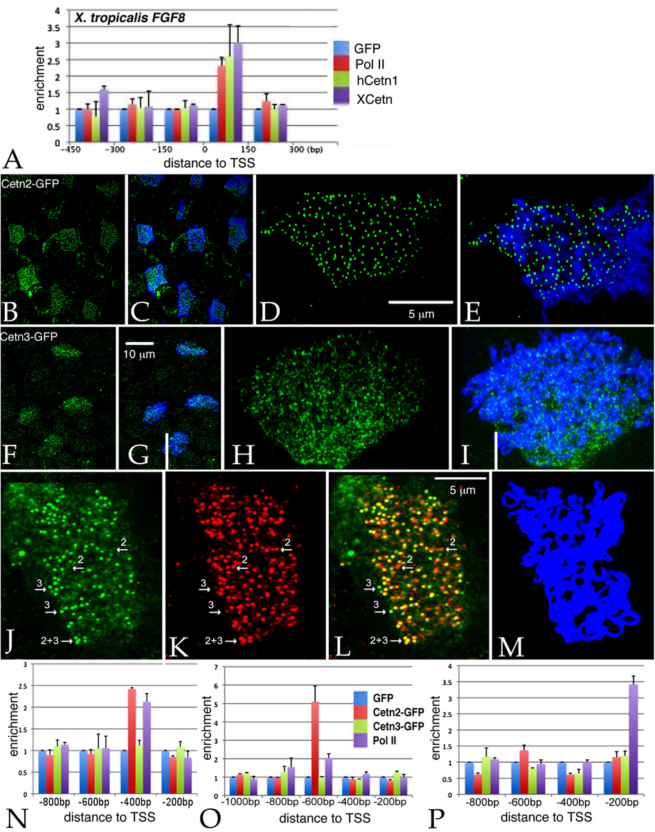 Figure 5. A: Unmaninpulated X. tropicalis embryos were isolated at stage 11, subjected to ChIP using 2 μg of either anti-GFP antibody (as control), anti-Xenopus Cetn antibody, anti-human Cetn1 antibody, or anti-Pol II antibodies. Isolated embryonic DNA was analyzed by qPCR using primers directed against the FGF8 promoter region. The distance from the transcription start site (TSS) is noted. For similar studies in X. laevis, we first characterized the behavior of the myc-Cetn2-GFP and myc-Cetn3-GFP polypeptides in ectodermal explants. Fertilized eggs were injected with encoding either myc-Cetn2-GFP RNA (B-E), myc-Cetn3-GFP RNA (F-I), or both Cetn2-RFP and myc-Cetn3-GFP RNAs (K-M)(each RNA injected at 200 pg/embryo). Ectodermal explants were isolated at stage 9 and fixed at stage 18. Immunofluorescence staining was performed using both anti-GFP and anti-AAT antibodies; scale bar in part G indicates 10 μm for parts B,C,F and G. Scale bar in parts D & L indicates 5 μm for parts D,E,H,I and J-M. Confocal images were taken at either 40X (B,C,F,G) or 100X (D,E,H,I,J-M) magnification. It is readily apparent that both myc-Cetn2-GFP and myc-Cetn3-GFP polypeptides accumulate in ciliated cells. In explants expressing both myc-Cetn3-GFP (J) and Cetn2-RFP (K; overlap in panel L, panel M is ATT staining), there was both extensive overlap in the localization of Cetn2 and Cetn3 polypeptides (arrow marked “2 + 3”), as well as sites where one or the other predominates (arrows marked either “2” or “3”). For ChIP studies in X. laevis, both blastomeres of 2-cell stage embryos were injected with RNAs encoding either GFP, myc-Cetn2-GFP, or myc-Cetn3-GFP; uninjected embryos were used as a control. Embryos were harvested at stage 11. GFP antibody was used to immunoprecipitate the injected embryos and Pol II antibody was used to immunoprecipitate the uninjected embryos. qPCR analysis was performed to check protein binding to the FGFR1a (N), FGF8 (O) and BMP4a (P) promoter regions. |