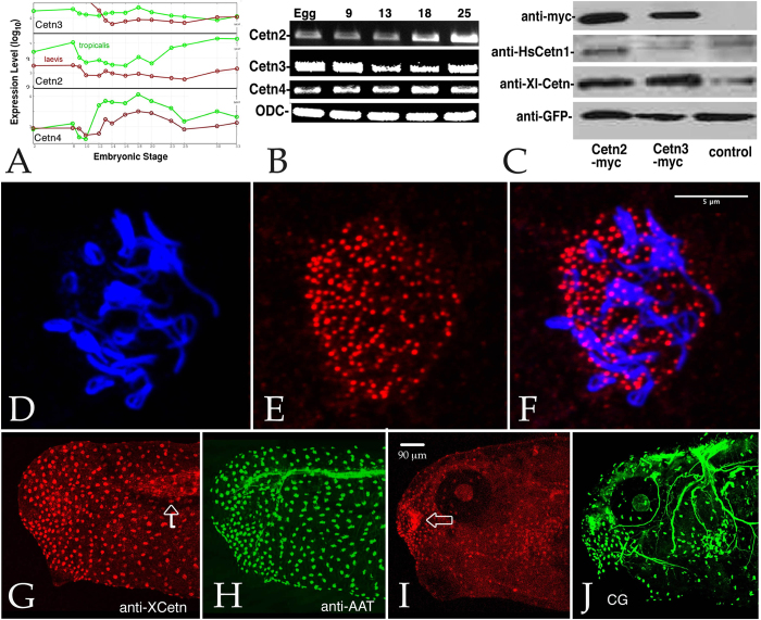 Figure 1. A: All three Cetn RNAs are present throughout the course of early development (data derived from Yanai et al. (2011)). B: This result was confirmed by RT-PCR analyses of Cetn2a, Cetn3l, and Cetn4 RNAs using ornithine decarboxylase (ODC) as a normalization control (embryonic stages are noted). C: Embryos injected with RNA (200 pg) encoding GFP alone or together with Cetn2a-myc or Cetn3l-myc were harvested at stage 11 and analyzed by SDS-PAGE-immunoblot. The anti-human Cetn1 antibody reacted preferentially with X. laevis Cetn2, while the anti-XlCetn antibody reacted with Cetn2 and Cetn3, as well as Cetn4 (data not shown). Ectodermal explants were fixed when sibling control embryos reached stage 18 and stained with anti-acetylated α-tubulin (AAT)(D) and anti-XlCetn antibodies (E; F displays the overlap of images in parts D and E); this revealed the localization of Cetns to the basal body region of cilia. A similar analysis was carried out on whole embryos (G,H - stage 25, I,J-stage 35) stained with anti-XlCetn (G,I) and anti-acetylated α-tubulin (H,J). Anti-Cetn staining of the myotome (arrow in part G) and Cetn’s localization to the olfactory region of the later stage embryo (arrow in part I) was obvious, as was its absence from the cement gland (“CG” in part J). Scale bar in part F marks 5 μm in parts D-F, scale bar in part I marks 90 μm in parts G-J. |