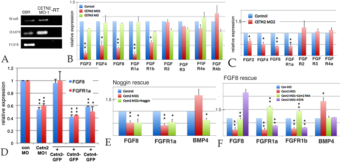 Figure 4. A: PCR analysis of control and Cetn2 MO embryos; there was a clear increase in BMP4 RNA, the disappearance of FGF8 RNA, and no apparent effect on Wnt8 RNA: B: qPCR analysis of Control, Cetn2MO1 and Cetn3MO embryos, injected in both cells of a two cell embryo and harvested at stage 11. C: A similar analysis carried out with the Cetn2MO2. D: qPCR analysis of embryos injected in both cells of a two cell embryo with Cetn2MO1 alone or together with Cetn2-GFP, Cetn3-GFP, or Cetn4-GFP RNAs (RNAs injected at 200 pg/side, total 400 pg/embryo; MOs injected at 10 ng/side, total 20 ng/embryo). While Cetn2-GFP RNA rescued the morphant phenotype Cetn3 or Cetn4 RNAs did not. E: qPCR analysis of embryos injected in both cells of two-cell embryos with Cetn2MO1 alone or together with Noggin RNA (200 pgs/embryo); Noggin reversed the morpholino effect on BMP4 RNA level but not the effect on FGF8 or FGFR1a RNA levels. F: qPCR analysis of embryos injected in both cells of a two cell embryo with Cetn2MO1 alone or together with either Cetn2-GFP or FGF8 RNAs (200 pgs/embryo); Cetn2 RNA rescued the Cetn2 morpholino’s effects on RNA levels, FGF8 reversed the effect on BMP4 RNA, but not the effects on FGFR1a RNAs. Levels of statistical significance indicated single * <0.05, double ** <0.001. |