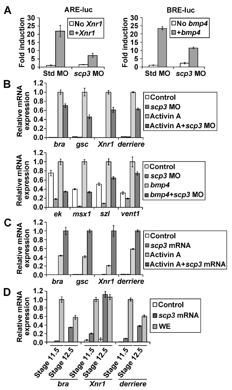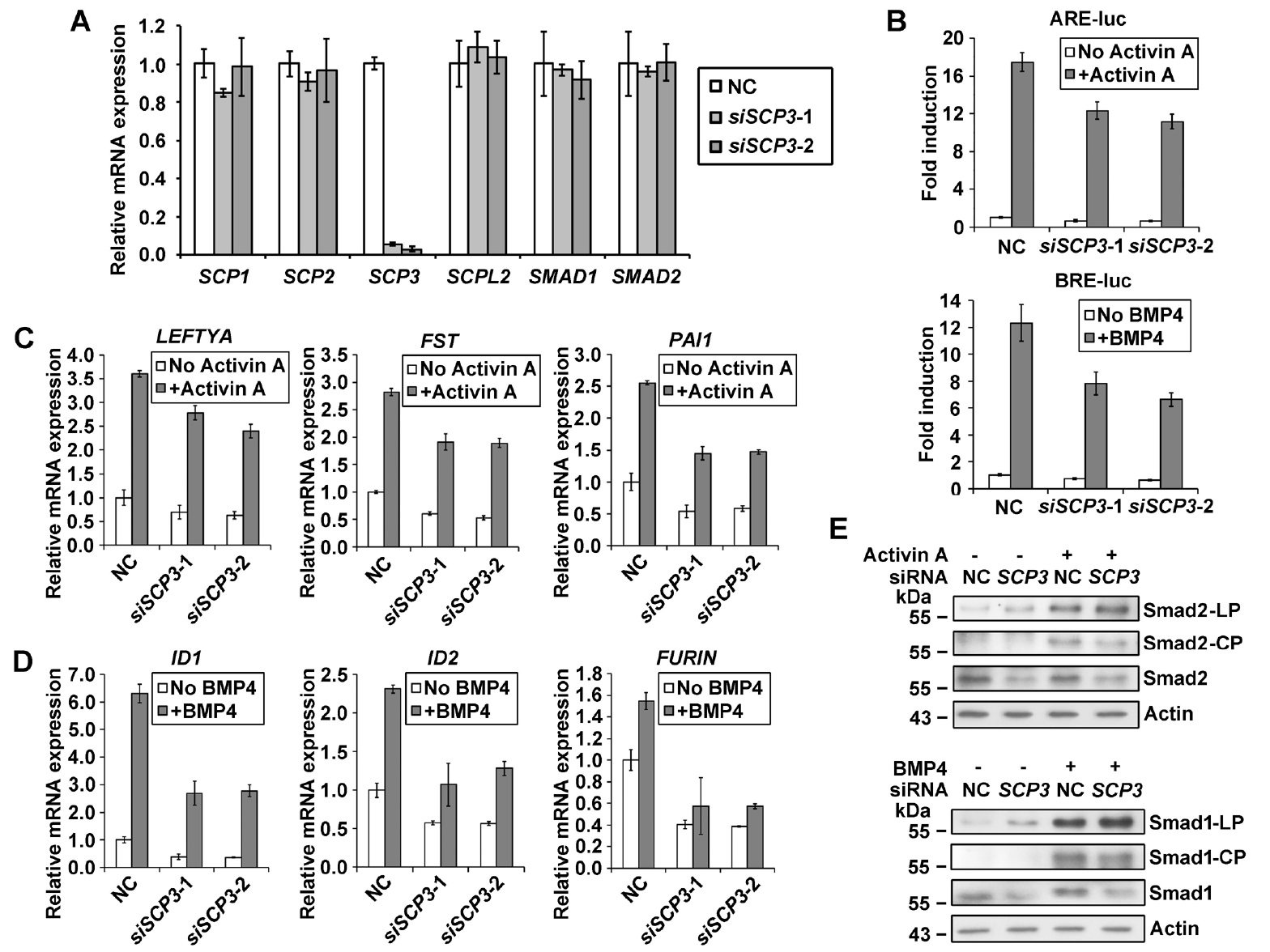 FIGURE 4. SCP3 is required for the Nodal/Activin and BMP signals. (A) Reporter assays with ARE and