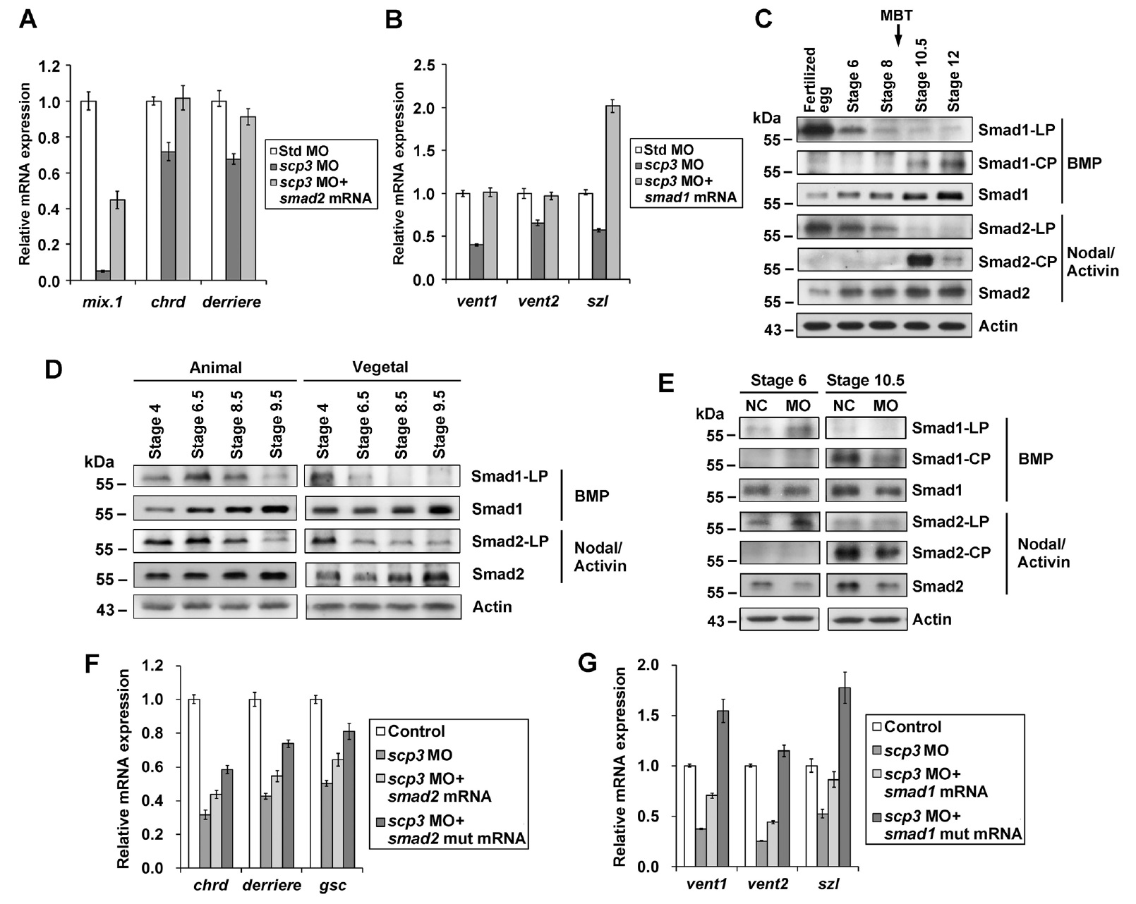 were coinjected with 40 ng of std MO or scp3 MO-1 and mRNA coding for Xenopus laevis Smad1 (1 ng).