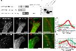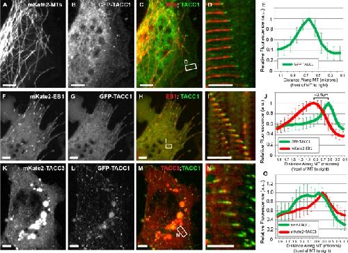 Figure 1. TACC1 can act as a plus‐end tracking protein in embryonic cells. Expression of mKate2‐tubulin (A), GFP‐TACC1 (B), and merge (C) in cultured mesenchymal cells derived from embryonic neural tube; see also Movies S1 in Supporting Information. (D) Magnified time‐lapse montages of the boxed region in panel C. The time interval between frames is 2.9 s. (E) Fluorescence intensity profile of GFP‐TACC1. Signals from 20 individual MTs were quantified by intensity line scans to present the relative fluorescence intensity profiles, with the plus‐end of the MT toward the right. Expression of mKate2‐EB1 (F), GFP‐TACC1 (G), and merge (H) in cultured embryonic mesenchymal cells; see also Movie S3 in Supporting Information. (I) Magnified time‐lapse montage of the boxed region in panel H. The time interval between frames is 2.7 s. For this panel, the green channel has been translated to the left by 0.27 µm to account for the different acquisition times of the red and green channels (the velocity of the plus‐end was consistently moving at 0.27 µm/s in this time series, and the green channel was imaged 1 s after the red channel). This allows for a more accurate visualization of colocalization between the two +TIPs. This demonstrates that, even after correcting for the time displacement, GFP‐TACC1 overlaps with and is distal to mKate2‐EB1. (J) Fluorescence intensity profiles of GFP‐TACC1 and mKate2‐EB1. Signals from 18 MTs were quantified by intensity line scans to present the relative fluorescence intensity profiles, with the plus‐end of the MT toward the right. For each measurement, the green channel has been translated to the left (approximately 0.2 µm) based on each individual MTs velocity, to account for the time displacement between channels. After the correction, the highest peak intensity of GFP‐TACC1 is ∼0.4 μm distal to the peak of mKate2‐EB1. Expression of mKate2‐TACC3 (K), GFP‐TACC1 (L), and merge (M) in cultured embryonic mesenchymal cells; see also Movie S4 in Supporting Information. (N) Magnified time‐lapse montage of the boxed region in panel M. The time interval between frames is 3.9 s. For this panel, the green channel has been translated to the left by 0.25 μm to account for the different acquisition times of the red and green channels (the velocity of the plus‐end was consistently moving at 0.21 µm/s in this time series, and the green channel was imaged 1.2 s after the red channel). (O) Fluorescence intensity profiles of GFP‐TACC1 and mKate2‐TACC3. Signals from 12 MTs were quantified by intensity line scans to present the relative fluorescence intensity profiles, with the plus‐end of the MT toward the right. For each measurement, the green channel has been translated to the left (approximately 0.1 µm) based on each individual MTs velocity, to account for the time displacement between channels. While mKate2‐TACC3 and GFP‐TACC1 mostly overlap, the peak of mKate2‐TACC3 is just slightly distal to GFP‐TACC1. Also, we found that GFP‐TACC1 comets were consistently longer when mKate2‐TACC3 was expressed. Note that mKate2‐TACC3 is less effective at tracking MT plus‐ends than GFP‐TACC3 [observed in Nwagbara et al., 2014]. One reason for this is that the presence of the mKate2 tag leads to more efficient cleavage of the C‐terminal TACC domain (not shown), which is required for MT plus‐end tracking. Moreover, note that in images K–M, yolk granules are strongly autofluorescing. Bar 5 µM. |