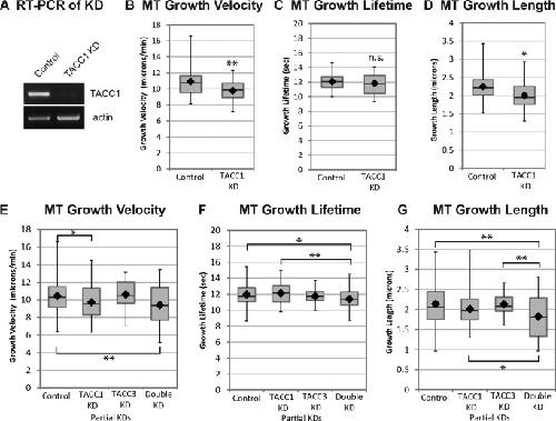 Figure 4. TACC1 KD reduces MT growth velocities, while double KD of both TACC1 and TACC3 also reduces MT growth lifetime. Quantification of MT growth track parameters after TACC1 and TACC3 knockdown in cultured embryonic mesenchymal cells derived from neural tube. (A) RT‐PCR demonstrates knockdown of normal TACC1. Automated tracking of mKate2‐EB1 comets after TACC1 knockdown is used to calculate MT growth track velocity (B), MT growth track lifetime (C), and MT growth track length (D). Mean values: MT growth velocity, control, 10.9 µm/min, TACC1 KD 9.8 µm/min; MT growth lifetime, control, 12.1 s, TACC1 KD 11.8 s; MT growth length, control, 2.2 µm, TACC1 KD 2.0 µm. Control data are the means of 52 cells, representing a total of 12,947 analyzed MT growth tracks; TACC1 KD are from 24 cells and 9435 analyzed MT growth tracks. (E–G) Quantification of MT parameters after double TACC1/TACC3 knockdowns (TACC1 mRNA levels were reduced approximately 25% while TACC3 was reduced approximately 40%, not shown). Mean values: MT growth velocity, control, 10.5 µm/min, TACC1 partial KD 9.7 µm/min, TACC3 partial KD 10.6 µm/min, TACC1/TACC3 double partial KD 9.4 µm/min; MT growth lifetime, control, 12.0 s, TACC1 partial KD 12.1 s, TACC3 partial KD 11.8 s, TACC1/TACC3 double partial KD 11.4 s; MT growth length, control, 2.1 µm, TACC1 partial KD 2.0 µm, TACC3 partial KD 2.1 µm, TACC1/TACC3 double partial KD 1.8 µm. Control data are the means of 92 cells (from 5 individual experiments), representing a total of 25,266 analyzed MT growth tracks; TACC1 partial KD are from 80 cells and 22,637 analyzed MT growth tracks; TACC3 partial KD are from 31 cells and 8,143 analyzed MT growth tracks; TACC1/TACC3 double partial KD are from 44 cells and 21,531 analyzed MT growth tracks. Box‐and‐whisker plots indicate the mean (diamond), median, extrema, and quartiles. To determine statistical significance for panels E–G, an ANOVA test was performed first (which revealed that the means were not the same for any condition), followed by an unpaired t‐test to assess significance between conditions. **P < 0.01, *P < 0.05; n.s., not significant. |