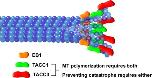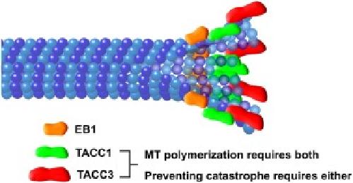 Figure 5. Cartoon schematic of TACC localization at the MT plus‐end. Our data suggest a model in which TACC3 (red) is at the distal‐most end, with TACC1 (green) overlapping with and slightly proximal to TACC3. EB1 (orange) lies further proximal to TACC1. Both TACC1 and TACC3 are required for maintaining normal rates of MT polymerization, while normal levels of either of TACC1 or TACC3 appears to be sufficient for preventing MT catastrophe. Note that it is still unclear whether TACC3 and TACC1 can bind to the plus‐end independently of other factors, or whether other +TIPs are required (such as XMAP215, which interacts directly with TACC3). Not drawn to scale. |