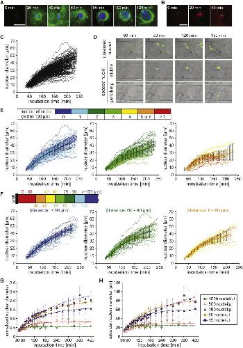 (G and H) Dynamics of mean normalized (G) and absolute (H) nuclear expansion at each time point of incubation with different concentrations of nuclei (color-coded) in the test tube. Each dataset was fit to pseudo-first-order association kinetics (dashed line). Data represent the mean ± SD. |