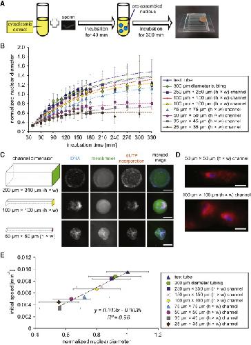 (A) For all experiments, pre-assembly of the nuclei (150/μl) was carried out by incubation for 40 min in a test tube. Subsequently, the extract containing the pre-assembled nuclei was injected into the micro-channels and incubated for another 300 min.