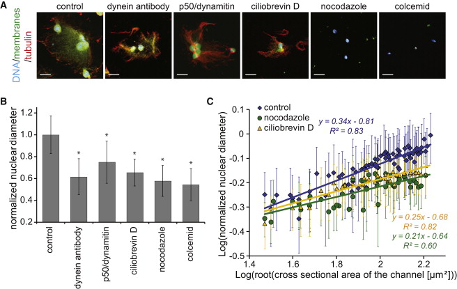 (E) Normalized diameter of nuclei incubated in the flow channel in the presence of different inhibitors (nocodazole or anti-dynein antibody). âp < 0.05. Data represent the mean ± SD.