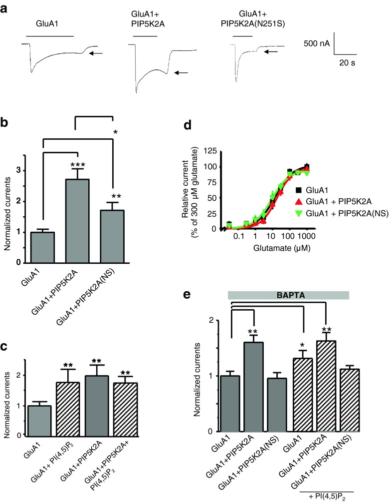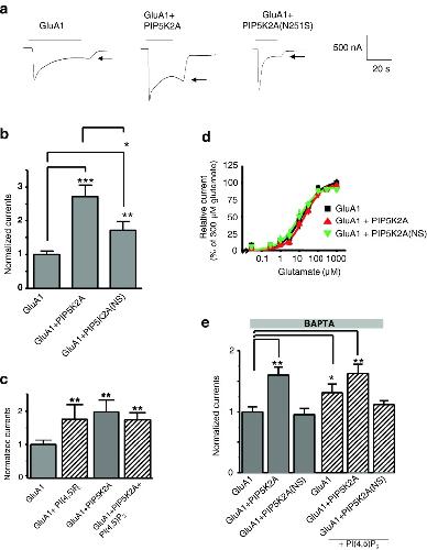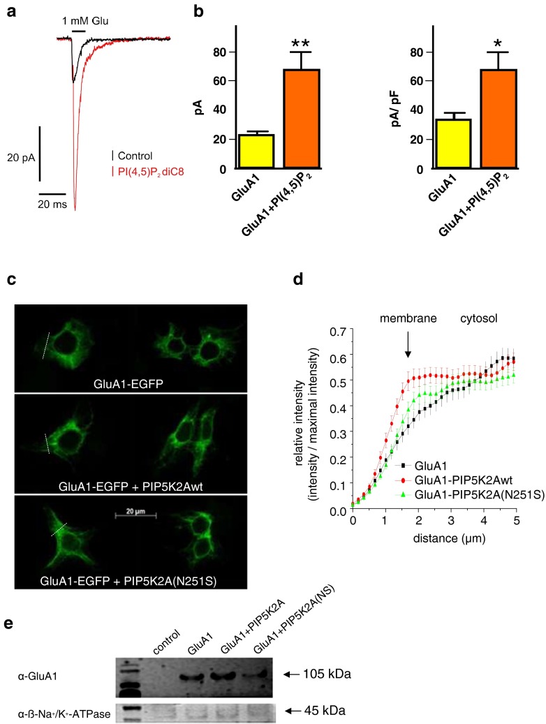 Ionotropic glutamate receptors are the most important excitatory receptors in the central nervous system, and their impairment can lead to multiple neuronal diseases. Here, we show that glutamate-induced currents in oocytes expressing GluA1 are increased by coexpression of the schizophrenia-associated phosphoinositide kinase PIP5K2A. This effect was due to enhanced membrane abundance and was blunted by a point mutation (N251S) in PIP5K2A. An increase in GluA1 currents was also observed upon acute injection of PI(4,5)P2, the main product of PIP5K2A. By expression of wild-type and mutant PIP5K2A in human embryonic kidney cells, we were able to provide evidence of impaired kinase activity of the mutant PIP5K2A. We defined the region K813-K823 of GluA1 as critical for the PI(4,5)P2 effect by performing an alanine scan that suggested PI(4,5)P2 binding to this area. A PIP strip assay revealed PI(4,5)P2 binding to the C-terminal GluA1 peptide. The present observations disclose a novel mechanism in the regulation of GluA1.