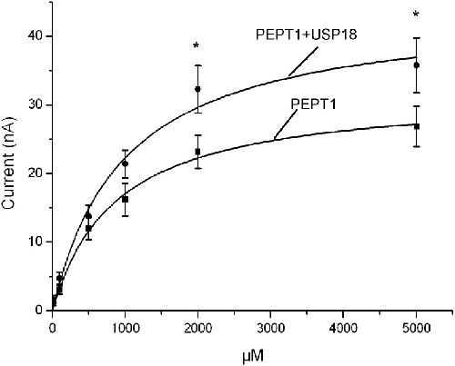 Fig 2. Coexpression of USP18 increases maximal electrogenic peptide transport in PEPT1-expressing Xenopus laevis oocytes.Arithmetic means ± SEM (n = 11–12) of Igly-gly as a function of glycine-glycine concentration in Xenopus laevis oocytes expressing PEPT1 without (black squares), or with (black circles) additional coexpression of wild type USP18. *(p<0.05) indicates statistically significant difference from the absence of USP18.