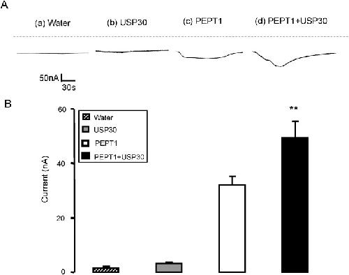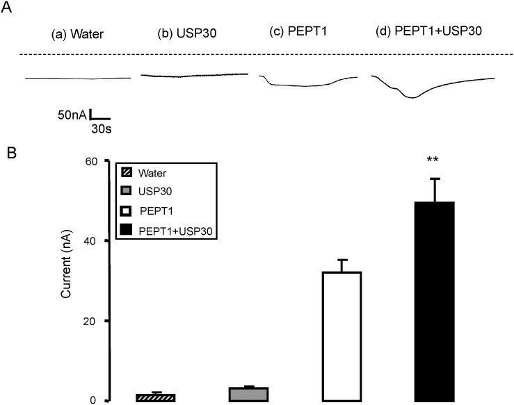 Fig 4. Coexpression of USP30 increases electrogenic peptide transport in PEPT1-expressing Xenopus laevis oocytes.A: Representative original tracings showing Igly-gly in Xenopus laevis oocytes injected with water (a), expressing USP30 alone (b) or expressing PEPT1 without (c) or with additional coexpression of wild type USP30 (d). B: Arithmetic means ± SEM (n = 14–16) of Igly-gly in Xenopus laevis oocytes injected with water (striped bar), or expressing USP30 alone (grey bar) or expressing PEPT1 without (white bar) or with (black bar) USP30. ** (p<0.01) indicates statistically significant difference from the absence of USP30.