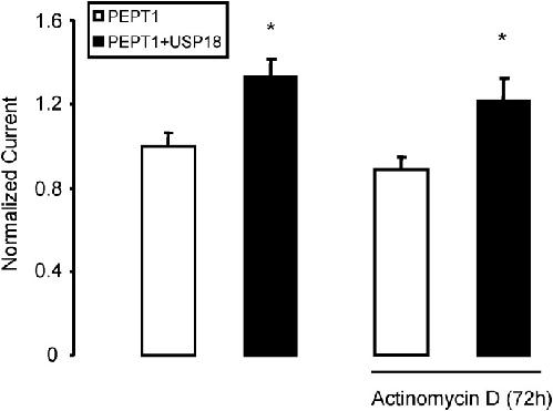 Fig 5. Effect of USP18 on PEPT1 in absence and presence of Actinomycin D.Arithmetic means ± SEM (n = 15–16) of Igly-gly in Xenopus oocytes injected PEPT1 without (white bar) or with (black bar) wild type USP18 in the absence (left bars) and presence (right bars) of 50 nM Actinomycin D 72 hours prior to measurement. *(p<0.05) indicates statistically significant difference from the absence of USP18.