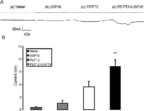 Fig 6. Coexpression of USP18 increases electrogenic peptide transport in PEPT2-expressing Xenopus laevis oocytes.A: Representative original tracings showing Igly-gly in Xenopus laevis oocytes injected with water (a) or expressing USP18 alone (b) or expressing PEPT2 without (c) or with additional coexpression of wild type USP18 (d). B: Arithmetic means ± SEM (n = 8–9) of Igly-gly in Xenopus oocytes injected with water (striped bar), expressing USP18 alone (grey bar), or expressing PEPT2 without (white bar) or with (black bar) wild type USP18. **(p<0.01) indicates statistically significant difference from the absence of USP18.