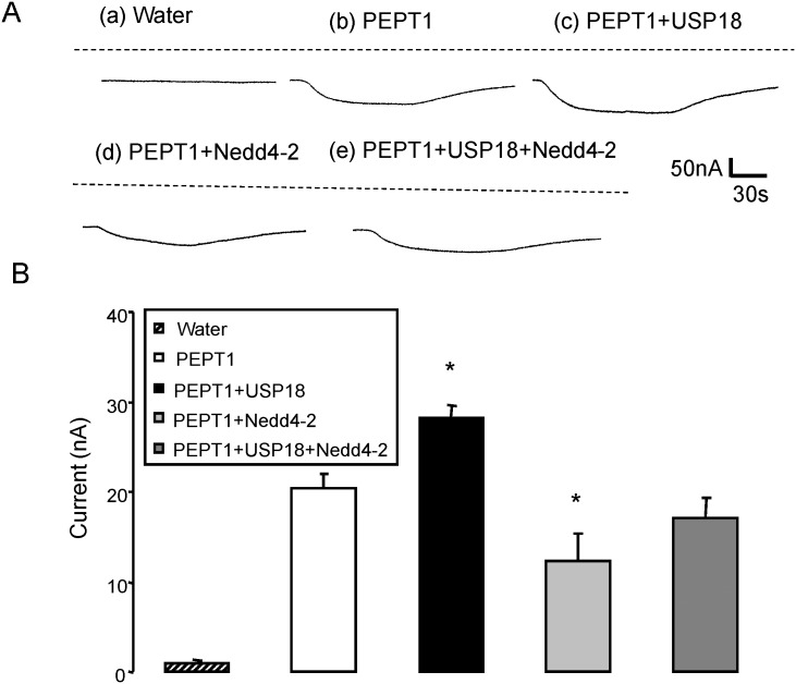 Fig 3. Coexpression of Nedd4-2 decreases electrogenic peptide transport in PEPT1-expressing Xenopus laevis oocytes.A: Representative original tracings showing Igly-gly in Xenopus laevis oocytes injected with water (a), expressing PEPT1 alone (b) or with USP18 (c), Nedd4-2 (d), or with USP18 and Nedd4-2 (e). B: Arithmetic means ± SEM (n = 13–15) of Igly-gly in Xenopus laevis oocytes injected with water (striped bar) or expressing PEPT1 without (white bar) or with USP18 (black bar), with Nedd4-2 (light grey bar), or with USP18 and Nedd4-2 (dark grey bar). *(p<0.05) indicates statistically significant difference from oocytes expressing PEPT1 alone.
