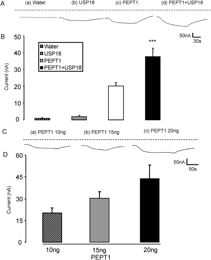 Fig 1. Coexpression of USP18 increases electrogenic peptide transport in PEPT1-expressing Xenopus laevis oocytes.