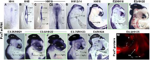 Jostes, The murine paired box gene, Pax7, is expressed specifically during the development of the nervous and muscular system. 1990, Pubmed , Xenbase