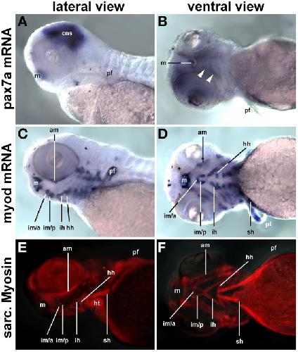 Figure 13. pax7a mRNA, myod mRNA, and sarcomeric myosin expression (MF20 antibody staining) in 72 hpf zebrafish larvae, lateral views, anterior to the left; markers are indicated on the left of the panel. While myogenic markers show robust expression in craniofacial muscle anlagen, pax7 mRNA is barely detectable (arrowheads). Abbreviations as before and: am, adductor mandibulae; hh, hyohyoideus; hpf, hours post fertilization; ih, interhyoideus; im/a, intermandibularis anterior muscle; im/p, intermandibularis posterior muscle; m, mouth; pf, pectoral fin; sh, sternohyoideus. |