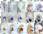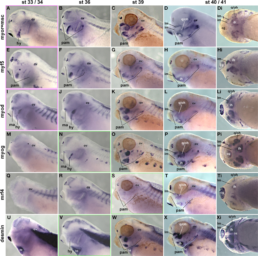 Figure 11 E- H'. Time course of myl5 () gene expression in Xenopus laevis, lateral views, anterior left, dorsal up. Key: pam: pharygeagel arch musculature; hp= hypophysis; ht= heart; hy = hyoid arch; im= m. intermandibularis primordium; lm= m. levatores mandibulae primordium; ih=m. interhyoideus primordium; oh= m. orbitohyoideus primordium; qh= m. quadrato-hyoangularis primordium; q/oh=common oh and qh precursor; ov= otic vesicle |