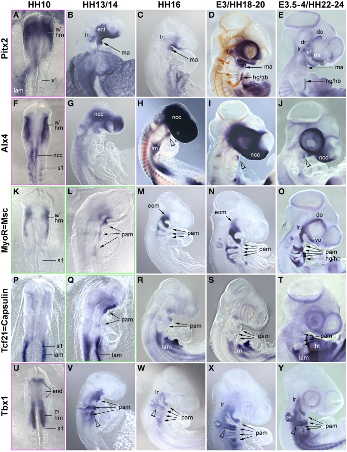 Figure 3. Time course for the mRNA expression of head mesoderm markers in chicken embryos at HH10 (dorsal views) and HH13/14-E4 (lateral views); in (D), cranial nerves are revealed with the RMO270 antibody (brown staining). Gene names are displayed on the left of the panel; developmental stages are indicated at the top. The onset of marker gene expression is demarcated by a green frame, for genes being expressed earlier than HH10, frames are displayed in magenta. Abbreviations as in Figure 1 and: a/hm, anterior head mesoderm; ect, surface ectoderm; eom, extraocular muscle anlagen; end, endoderm; lam, lateral mesoderm; ht, heart; ov, otic vesicle; pam, pharyngeal arch muscle anlagen; p/hm, posterior head mesoderm. The open arrowhead in (H,J) points at Alx4 expression in the mandibular arch ectoderm and in (V–Y) at Tbx1 expression in the posterior ectoderm of the hyoid (2nd pharyngeal) arch. Note that all head mesoderm markers begin their expression well before Pax7. With the exception of Alx4 which from HH13/14 onwards mainly labels cranial neural crest cells and Tcf21/Capsulin which throughout has lower expression levels than its paralog MSc/MyoR, all head mesoderm markers continue to strongly label the myogenic head mesoderm. Their expression domains are wider than that of Pax7, whose expression domain is nested in the expression domain of the head mesoderm genes (compare Figures 1, 4). |
