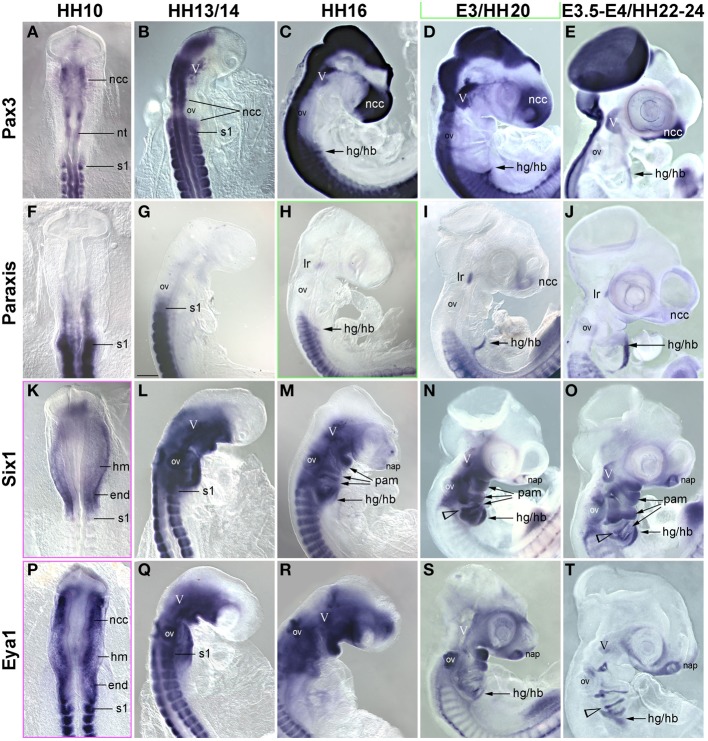 Figure 6. Time course for the mRNA expression of trunk pre-myogenic genes; embryos are displayed and annotated as in Figures 3–5. Abbreviations as before and: na, nasal pit. (A–E) Pax3 labels the central nervous system, the frontonasal neural crest, the trigeminal ganglion, the somites and the somite-derived hypobranchial and limb muscle precursors, but remains absent from genuine craniofacial muscle anlagen. (F–J) Paraxis expression overlaps with that of Pax3 and 7 in the somite-derived muscle precursors and in the frontonasal crest. Similar to Pax7, Paraxis is also expressed in the lateral rectus eye muscle, but is absent from all other craniofacial muscles. Six1 (K–O) and Eya1 (P–T) are expressed in the head mesoderm before and at HH10. From that stage onwards mesoderm expression becomes somewhat obscured by the overlying expression in neural crest cells. However, Six1 (but not Eya1) remains detectable in craniofacial muscle anlagen. |