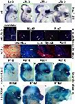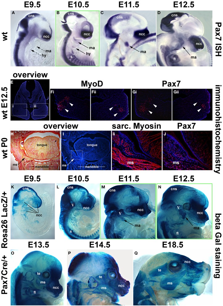 Figure 7. Time course of Pax7 expression in the mouse. (A–D) Pax7 mRNA expression from E9.5-E12.5 of development; lateral views of the right side of embryos, anterior to the top. Expression is readily detectable in the developing central nervous system, emigrating neural crest cells (prolonged expression in the frontonasal neural crest) and the somites. Head muscle anlagen show expression first at E10.5. (E) Serial cross sections of the mandibular arch at E12.5, dorsal to the top; (F,G) higher magnifications of the areas indicated by the boxes in (E) and stained for Dapi and MyoD protein (Fi,ii) or Dapi and Pax7 protein (Gi,ii). Note that MyoD and Pax7 domains overlap. (H,I) Serial frontal sections of the mandible at birth (P0), dorsal to the top, lateral to the left. (H) Sirius Red staining showing muscle fibers in yellow and bone and connective tissue in red. (I) Dapi staining of the same region, with (Ii) showing a magnification of the cheek and the floor of the mouth as indicated in (I). Skeletal muscle fibers are shown in red. (J) Subsequent section stained for Pax7 protein in red. Note the punctate, nuclear staining for Pax7, associated with the Myosin-positive muscle fibers. (K–Q) Lineage tracing of Pax7 expressing cells, revealed by beta galactosidase staining; lateral views of the right side of embryos, dorsal to the top. With a delay of 1 day, cells with a history of Pax7 expression can be detected in the central nervous system, the trigeminal ganglion, the frontonasal neural crest and the somites. In craniofacial muscle anlagen, cells with a history of Pax7 expression can be detected between E11.5 and E12.5, with a more robust staining appearing at E13.5. Eventually, all craniofacial muscles are stained and the staining is found in muscle fibers, indicating that, similar to the trunk, Pax7-positive cells contribute to fetal and perinatal muscle growth. Abbreviations as in Figures 1, 3, 4 and: fl, forelimb; ISH, in situ hybridisation; ms, masseter; te, temporalis muscle; wt, wildtype. |