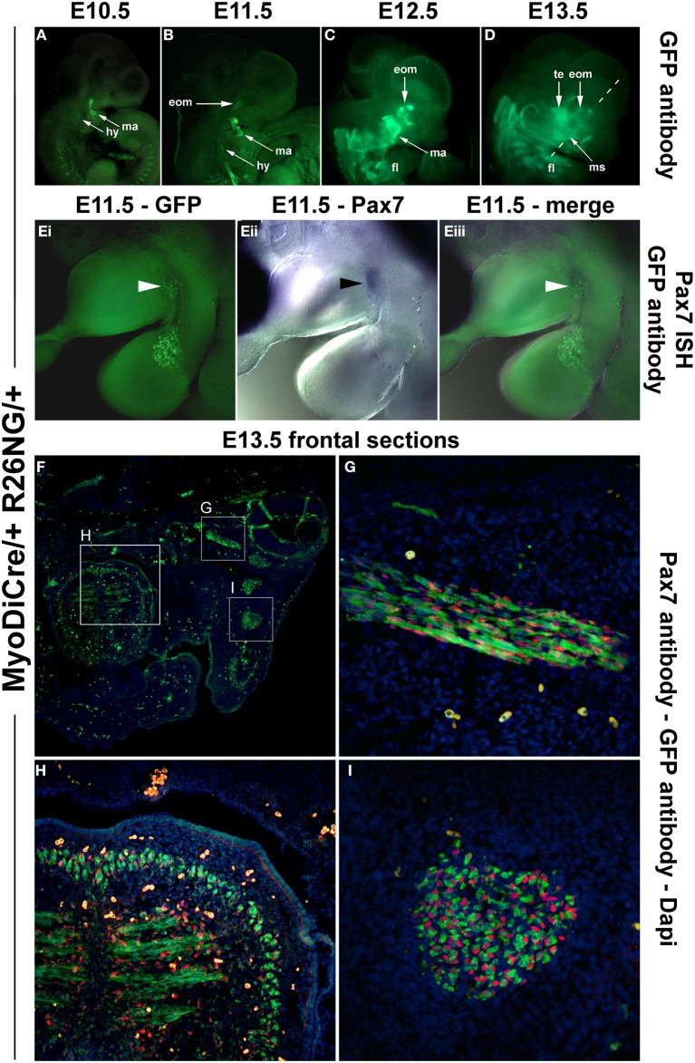 Figure 9. Lineage tracing of MyoD expressing cells in MyoDiCre/+ R26NG embryos, revealed by anti-GFP antibody (green) staining. (A–D) Lateral views of the right side of E10.5-E13.5 embryos; the dotted line indicates the sectional plane in (F–I). (Ei-iii) Lateral views of the left side of an E11.5 embryo, stained for Pax7 mRNA (blue) and GFP protein (green); dorsal to the top. (F) Frontal section of an E13.5 embryo, stained for Pax7 protein (red), GFP (green), and Dapi (blue). (G) Detail of the ventral rectus eye muscle, (H) detail of the tongue, (I) detail of the masseter as indicated in (D,F). The widely distributed bright green (F) or yellow cells (G–I) are autofluorescing blood cells. Cells with a history of MyoD expression can readily be detected at E10.5 and 11.5, first in the mandibular and hyoid arch, then in the developing extraocular muscles. In head-mesoderm-derived muscles, Pax7 mRNA and subsequent protein expression colocalises with that of MyoD-Cre driven GFP, and Pax7 containing nuclei reside in GFP expressing cells. In contrast, in the somite-derived tongue muscle, most Pax7-positive nuclei are not located in GFP expressing cells. Abbreviations as in Figures 1, 4, 5 and: eom, developing extraocular muscles. |