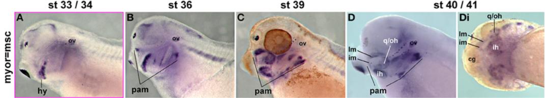 Figure 11 A- D. Time course of msc (musculin) gene expression in Xenopus laevis, lateral views, anterior left, dorsal up. Key: pam: pharygeagel arch musculature; hp= hypophysis; ht= heart; hy = hyoid arch; im= m. intermandibularis primordium; lm= m. levatores mandibulae primordium; ih=m. interhyoideus primordium; oh= m. orbitohyoideus primordium; qh= m. quadrato-hyoangularis primordium; q/oh=common oh and qh precursor; ov= otic vesicle |