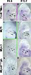 Figure 10. Time course of pax7 mRNA expression in Xenopus laevis. Lateral views, anterior to the left. Embryonic stages are indicated at the top. Inset in (D): pharyngeal arches and head mesenchyme were dissected away from the left side to reveal the brain. Up to stage 36, Pax7 expression is confined to the central nervous system including the ventral diencephalon (arrowhead), the hypophysis (hp), and the frontonasal neural crest cells. Weak expression is also seen in the somites. From stage 39 onwards, weak expression can be detected in craniofacial muscle anlagen. Abbreviations as before and: cg, cement gland; hp, hypophysis; ht, heart; first arch derived muscle: im, m. intermandibularis anlage; lm, m. levatores mandibulae anlage; second arch derived muscle: ih, m. interhyoideus anlage; oh, m. orbitohyoideus anlage; qh, m. quadrato-hyoangularis anlage; q/oh, common oh and qh precursor. |