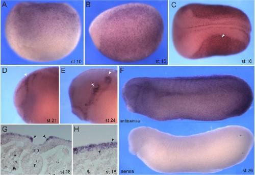 Fig. 2. Expression of prickle3 transcripts in Xenopus early embryos. Embryos were subjected to whole-mount in situ hybridization with Pk3 anti-sense RNA probe or sense probe as a control. Pk3 transcripts are present in the animal pole ectoderm of stage 10 gastrulae (A), and non-neural ectoderm of stage 15 neurulae (B). (C) Stage 18 embryo. Epidermal ectoderm is strongly positive (arrowhead), as compared to neuroectoderm. (D) Stage 21 embryo, anterior region, with staining in the profundal and posterior region placodes (arrowhead). (E) Stage 24 embryo, the otic vesicle and the posterior placodal region are positive (arrowheads). (F) Stage 26 embryos, tailbud. An embryo hybridized with the sense probe is shown on bottom. Anterior is to the left. Lateral view is shown in all panels, except dorsal view in C. (G, H) Cross-sections of stage 18 embryos. Arrowheads point to the staining in neural folds (G) and in both inner and outer layers of the epidermis (H). Positions of nuclei in the epidermis are outlined by dotted lines. Abbreviations: n, notochord, s, somites, np, neural plate. |