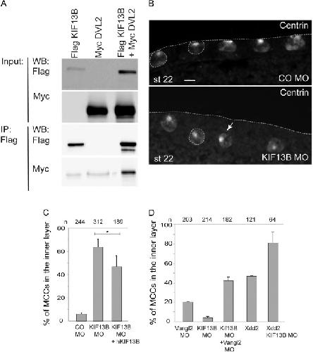 Fig. 4. KIF13B is a Disheveled-interacting protein that synergizes with PCP signaling to regulate MCC intercalation. (A) KIF13B co-immunoprecipitates with Disheveled. HEK293T cells were transfected with Myc-Dvl2 and FLAG-KIF13B. KIF-13B complexes were pulled down from cell lysates using anti-FLAG antibodies coupled to agarose, and both KIF13B and Myc-Dvl2 were visualized by western blotting. (B) Depletion of KIF13B affects MCC integration into the superficial cell layer. Control MO or KIF13B MO (40 ng each) were injected into 8-cell stage embryos. MCC migration was analyzed in cryosections of stage 22 embryos by immunostaining for centrin. Depletion of KIF13B induced MCC migration defects (arrow). Scale bar is 15 μm. (C). Quantification of MCC migration defects. Rescue experiments were performed by co-injecting KIF13B MO with 150 pg of human MYC-tagged KIF13B RNA. Data are presented as means±s. e. Statistical significance was determined by the Student's t-test (*, p<0.05). (D) Synergistic effects of KIF13B, Vangl2 and Disheveled on MCC intercalation. Eight-cell stage embryos were injected with Vangl2 MO (5 ng), KIF13B MO (10 ng), or Xdd2 mRNA (0.25 ng), separately or in combination as indicated. MCC migration was quantified as in (C). |