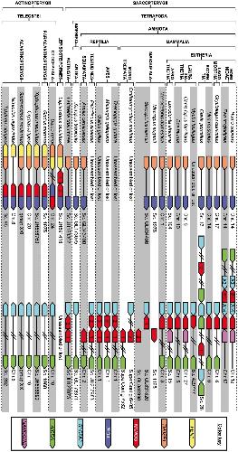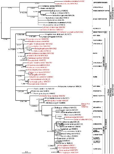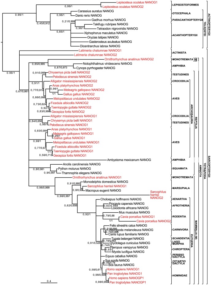 Figure 1. Phylogenetic analysis of NANOG paralogues in osteichthyans.Translated sequences of exons 2 and 3 were analyzed by Maximum Likelihood and Bayesian inference. Here we show a strict consensus tree, using the scaffold of the ML tree. Branch support was assessed and is given next to the relevant branches (top number: aLRT for the ML analysis and bottom number PP for the Bayesian analysis). The actinopterygian sequences form a monophyletic group that was used to root the tree. Duplicates are highlighted in red. Note that two paralogues are found in coelacanth (Latimeria chalumnae), Archosaurs (Alligator mississipiensis; Gallus gallus; Meleagris gallopavo; Taeniopygia guttata; Melopsittacus undulates; Anas platyrhynchos; Geospiza fortis; Ficedula albicollis), Testudines (Pelodiscus sinensis, Chrysemys picta belli), platypus (Ornithorhynchus anatinus), Tasmanian devil (Sarcophilus harrisii), Guinea pig (Cavia porcellus), Hominidae (Pan troglodytes; Homo sapiens) and spotted gar (Lepisosteus oculatus). The topology suggests that independent duplication events occurred in the three latter clades.