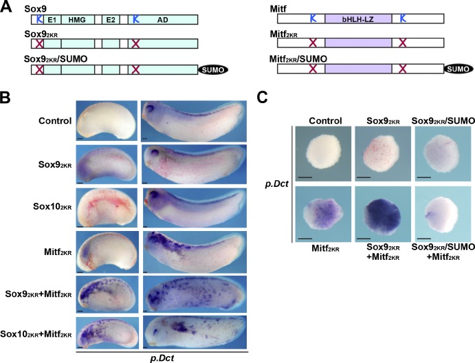 Figure 1. Effects of SoxE and Mitf isoforms on Dct expression in Xenopus embryos and animal caps. (A) Schematic of SoxE and Mitf proteins and SUMOylation mutants. (B) In situ hybridization showing Dct expression in embryos injected with SoxE2KR, Mitf2KR, or both. Both Sox92KR and Sox102KR act synergistically with Mitf2KR to induce premature and ectopic Dct expression in stage 23 and stage 28 embryos. (C) Animal cap assay showing effects of Sox92KR/SUMO on Mitf2KR-mediated induction of Dct at stage 28. Sox92KR enhances, whereas Sox92KR/SUMO blocks, Dct induction. Light red staining represents lineage tracer β-gal. Bars, 200 µm. AD, activation domain; LZ, Leucine zipper. |