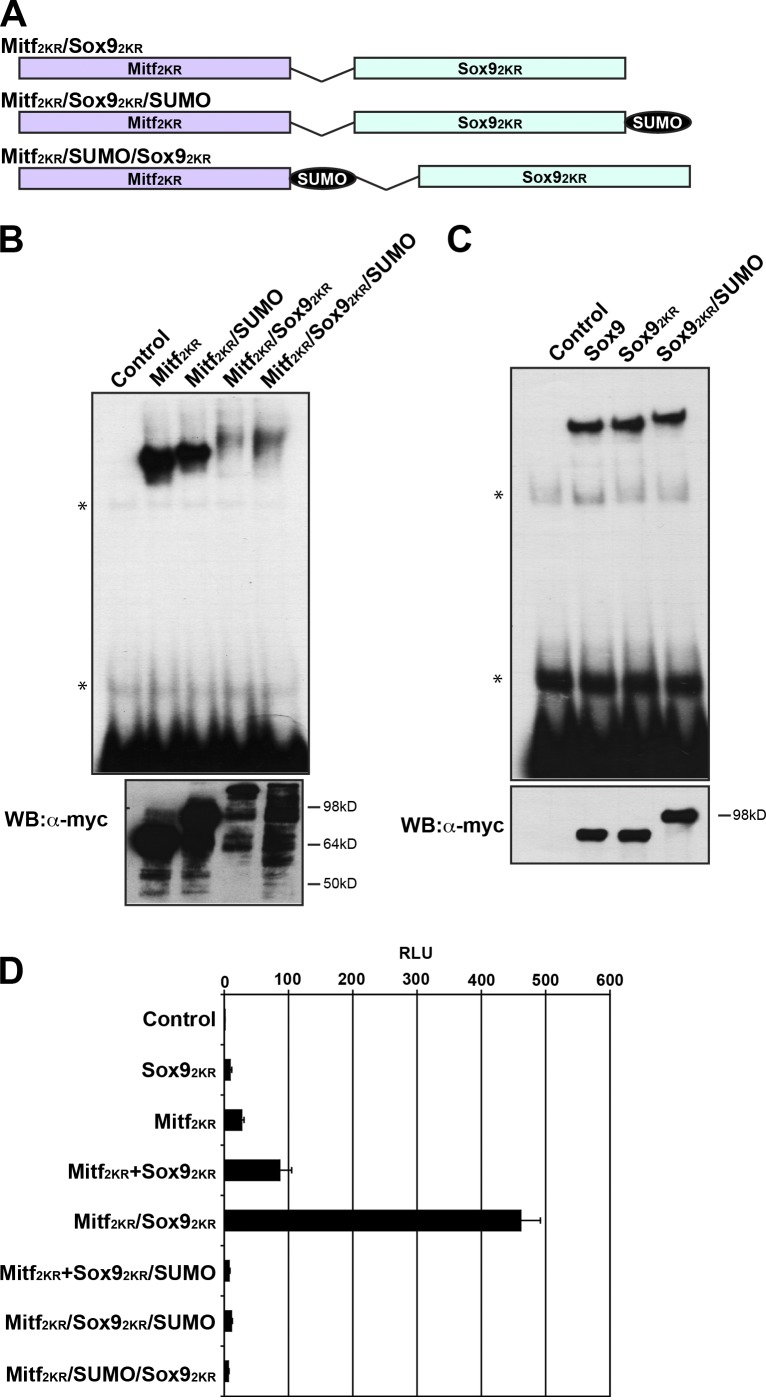 Figure 3. SUMOylation does not modulate Dct promoter activity through steric interference. (A) Schematic of Mitf/Sox9-tethered constructs used. (B and C) EMSA demonstrating DNA binding by Mitf isoforms, Mitf/Sox9-tethered proteins (B), and Sox9 isoforms (C). In vitro translated proteins were incubated with 32P-labeled probes containing S1/M sites (for Mitf and Mitf/Sox9 isoforms) or S4/4′ sites (for Sox9 isoforms) of the Dct promoter. Asterisks denote nonspecific bands. (D) Luciferase reporter assay using stage 17 embryos injected with Mitf/Sox9-tethered constructs or coinjected with Mitf and Sox9 isoforms. SUMO blocks promoter activation even when Mitf and Sox9 are tethered and thus corecruited. Error bars represent the standard deviation of the mean of triplicate assays. RLU, relative luciferase activity; WB, Western blot. |