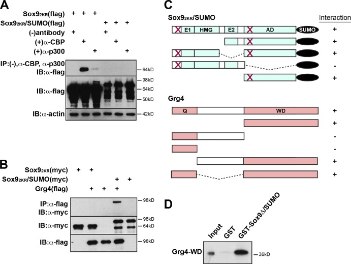 Figure 5. SUMOylation of Sox9 alters recruitment of transcriptional cofactors. (A) Coimmunoprecipitation from embryo lysates expressing flag-tagged Sox9 isoforms. Immunoprecipitation used antibodies against endogenous CBP or p300 followed by Western analysis with α-flag. A mock antibody treatment (−) was used as a negative control. SUMOylation blocks interaction with CBP or p300. (B) Coimmunoprecipitation from embryos injected with Myc-tagged Sox9 isoforms and flag-tagged Grg4. Immunoprecipitation used a flag antibody followed by Western analysis with α-Myc. Sox92KR/SUMO, but not Sox92KR, interacts with corepressor Grg4. (C) Schematic summarizing results of interaction experiments using Grg4 and SoxE/SUMO deletion constructs. The Grg4-WD40 domain and the activation domain plus SUMO moiety of SoxE/SUMO are sufficient for interaction. (D) GST pull-down experiment demonstrating direct interaction between the Grg4-WD40 domain and the Sox9 activation domain (AD)–SUMO fusion. IB, immunoblot; IP, immunoprecipitation. |