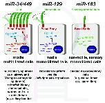 Figure 1. Specific expression of microRNAs in ciliated cell types. The miR-34/449 family is expressed in mucociliary multiciliated cells, where it inhibits cp110 to promote ciliogenesis of motile cilia (left). miR-129 is required for inhibition of cp110 and ciliogenesis of motile mono-cilia (middle). The miR-183 family is expressed in non-motile ciliated neurosensory cells, but their precise role is not elucidated yet (right).