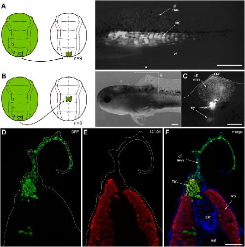 Figure 5. Central part of the posterior region 3 plate gives rise to fin mesenchyme and muscle.Homotopic transplantation (A) and heterotopic transplantation (B) of medial GFP+ neural plate tissue from the posterior region 3 of a GFP+ donor (stage 15) to a white (d/d) host (stage 15). A, visualization of graft-derived GFP+ cells in the myotomes (my) of the posterior trunk and anterior tail of a host at stage 41; dorsal fin mesenchyme (mes) is also GFP+; white arrowhead points to position of cloaca. B–F, visualization of GFP+ cells in the dorsal fin of the anterior trunk of a host at stage 41. D–F, demonstration of GFP+ fin mesenchyme (mes) and striated paraxial muscle on transverse sections (plane indicated in C). White lines in C–E help to see the outlines of dorsal parts of larvae. Number of experiments: A, 9; B, 3. Abbreviations: df, dorsal fin; vf, ventral fin; mes, mesenchyme; my, myotome; spc, spinal cord; not, notochord. Scale bars: 1 mm (A), 500 mm (B and C) and 200 mm (F). |